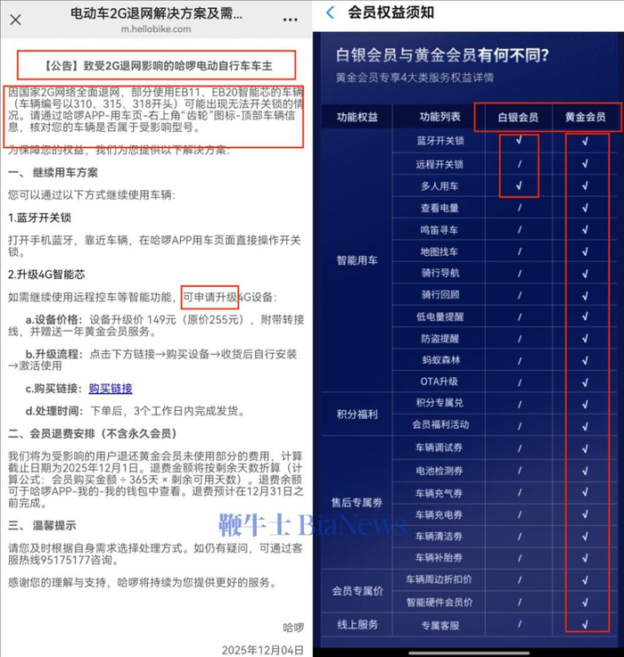在哈啰App内,哈啰对此次变故的原因作了简单解释:“因国家2G网络全面退网,部分使用EB11、EB20智能芯的车辆可能出现无法开关锁的情况”。而公司给出的继续用车方案则是:用户可通过蓝牙启动开关锁,或自费购买“4G智能芯”,对于被影响的用户只承诺退还不含永久会员的部分会员费。